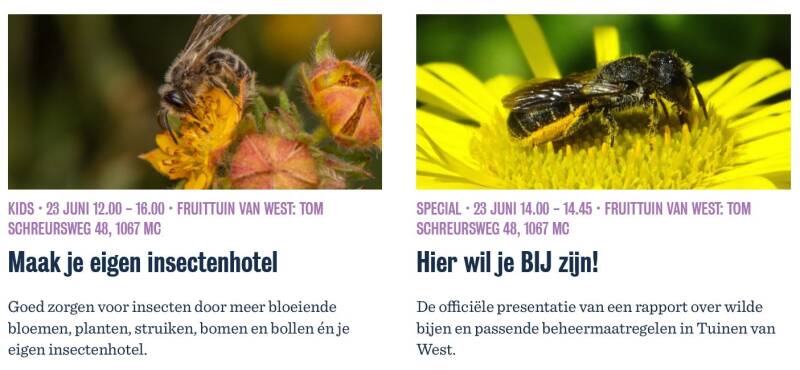 14:00 - 14:45 feestelijke presentatie van het rapport met resultaten van inventarisatie wilde bijen in Tuinen van West met beheeradviezen met presentaties door Anneke Teepe en Arie Koster
